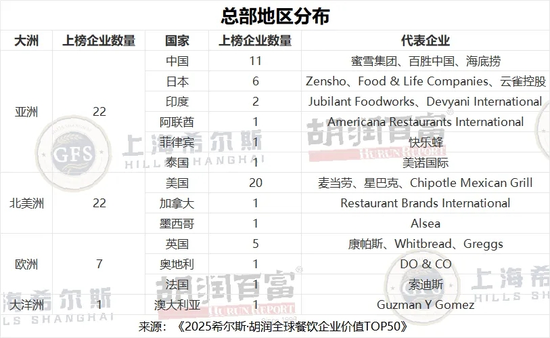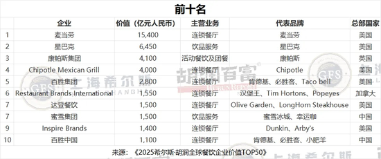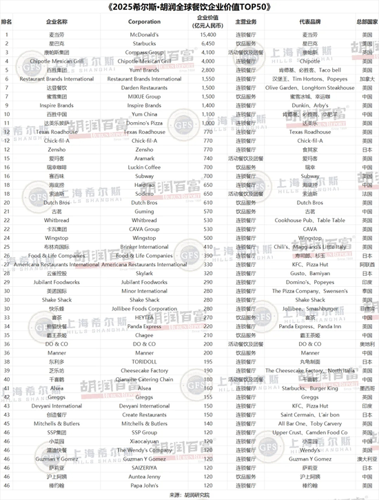 《2025·胡润全球餐饮企业价值TOP50》具体名单: